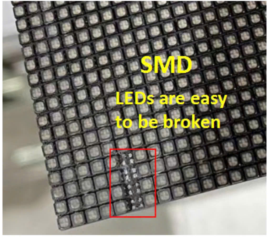 SMD (Surface Mounted Device) là công nghệ gắn linh kiện LED trực tiếp lên bảng mạch in (PCB). Mỗi điểm ảnh trên màn hình là một tổ hợp ba đi-ốt LED nhỏ (đỏ, xanh lá, xanh dương) tạo thành một điểm ảnh RGB.